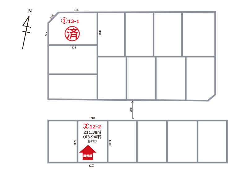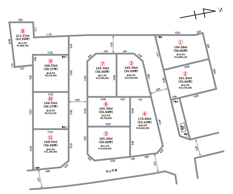 | 土地面積 | ①194.58㎡(58.86坪) ②181.83㎡(55.00坪) ③165.30㎡(50.00坪) ④176.60㎡(53.42坪) ⑤165.30㎡(50.00坪) ⑥165.30㎡(50.00坪) ⑦165.30㎡(50.00坪) ⑧211.57㎡(63.99坪) ⑨166.53㎡(50.37坪) ⑩166.53㎡(50.37坪) ⑪168.53㎡(50.98坪) |
