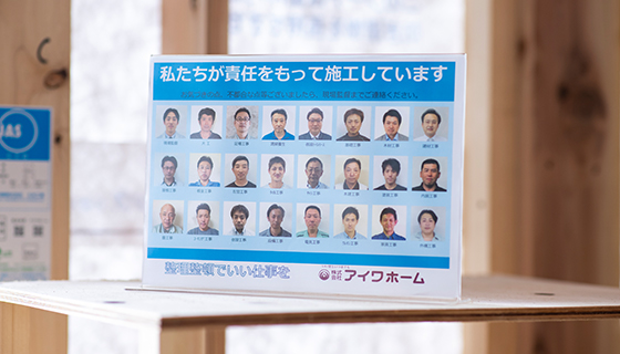 施工業者登録制度…建築現場ごとに工事を担当する大工、業者、社員をあらかじめ登録し、全員の氏名、所属、顔写真を掲載した看板を設置します。この「顔の見える家造り」は、工事に関わる者が責任と誇りを持って仕事をすることの証です。