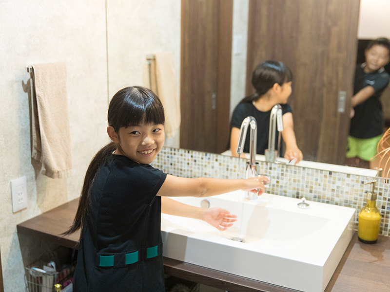ご主人:僕は、お客様もよく使う洗面所やトイレの内装も自分たちらしいものにしたいと考えていました。勧められた壁紙は、自分たちでは決して選ばないものでしたが、めざす雰囲気にぴったりで、誰よりも私たちのつくりたい家を理解してくれていることが心強かったです。
