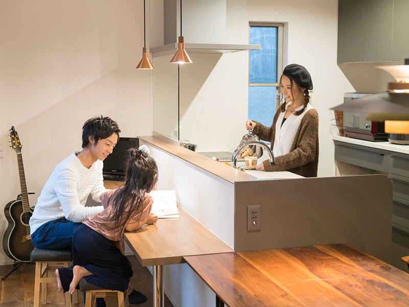 奥様:アイワホームで建てた家を訪問した際も、私たちが検討している間取りや雰囲気に近い住まいを選んで案内してくれました。生活している様子や建具の風合いを実際に見ることができ、キッチンや壁の色も安心して決められました。