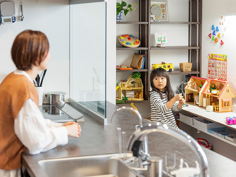 奥様:たくさん出した要望のほとんどが、家族が長い時間をすごす1階に関すること。キッズスペースはキッチン前につくりました。将来的には勉強スペースにするつもりなので、和室やリビングとは別にしたかったんです。