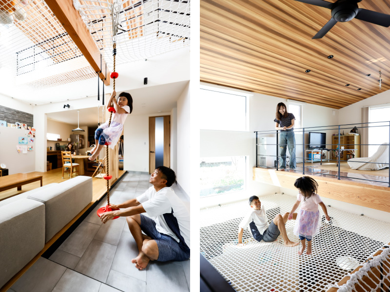奥様:本当につくるのか半信半疑でしたが、この家に暮らして2年の間に、アスレチックネットを編んだり、梁にブランコをぶら下げたり少しずつ計画を実行しています。