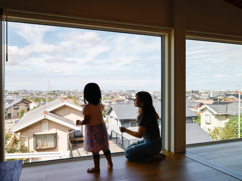 ご主人:吹き抜けを中心に室内を回遊する間取りは、設計士が高台の立地を生かして考えてくれました。大きく取った窓から、正面の市街地や裏手の山の景色を借景のように取り入れていて、すっかり気に入りました。