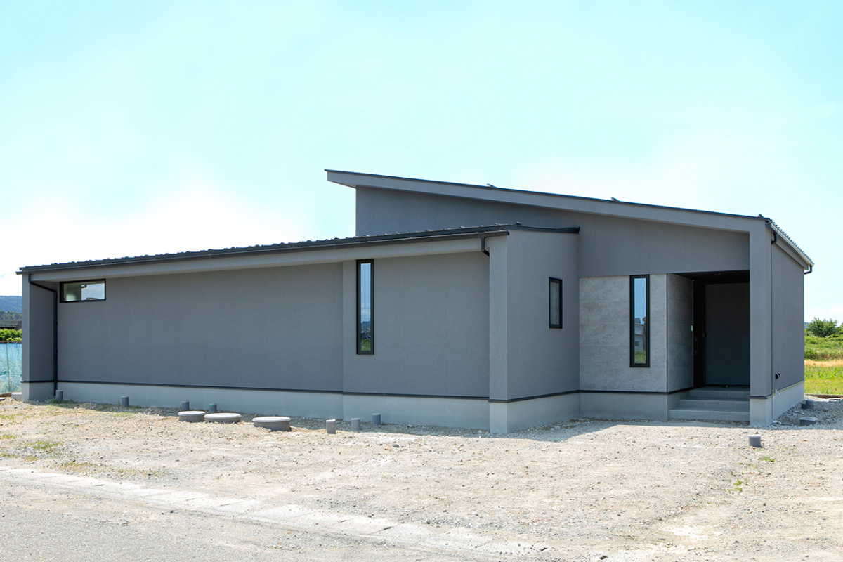 家族のライフスタイルに合わせた、平屋という選択。趣のあるシャープな外観。家族が集うリビングは高天井で開放的に。大容量のクローゼットや動きやすい家事動線。家族の理想を全て叶えた平屋の住まい。