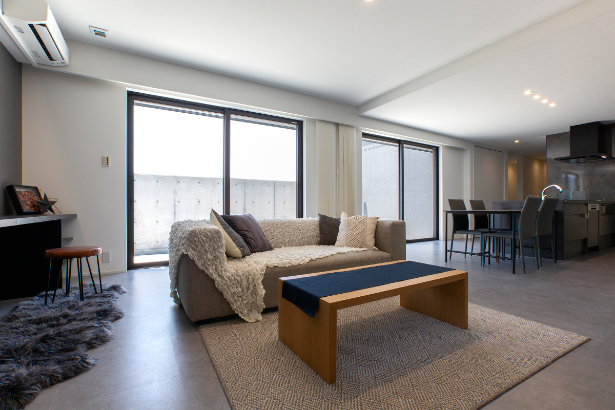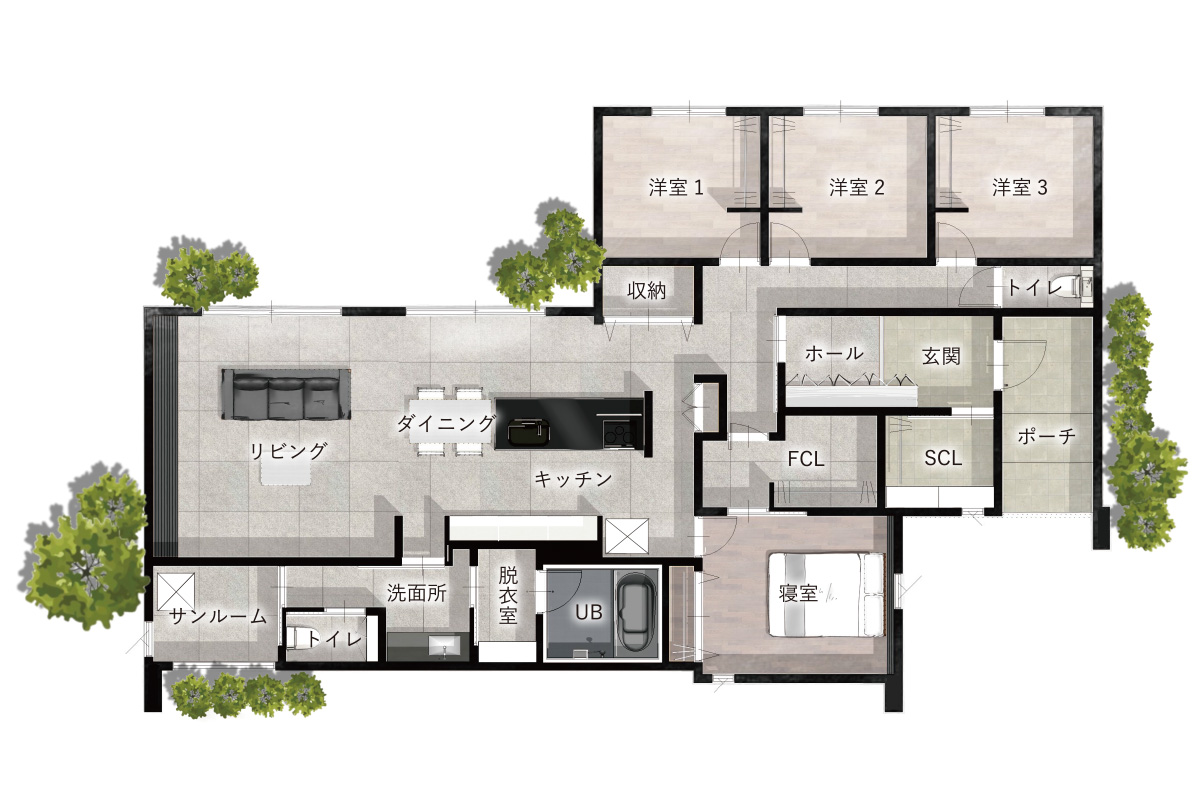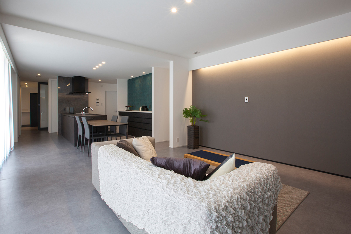 郊外ののんびりとした雰囲気の中に、スタイリッシュなモノトーンのお家をご覧いただけます。広々としたLDKや充実した収納、部屋数も充実しており、子供たちが走り回れるテラスも完備しています。