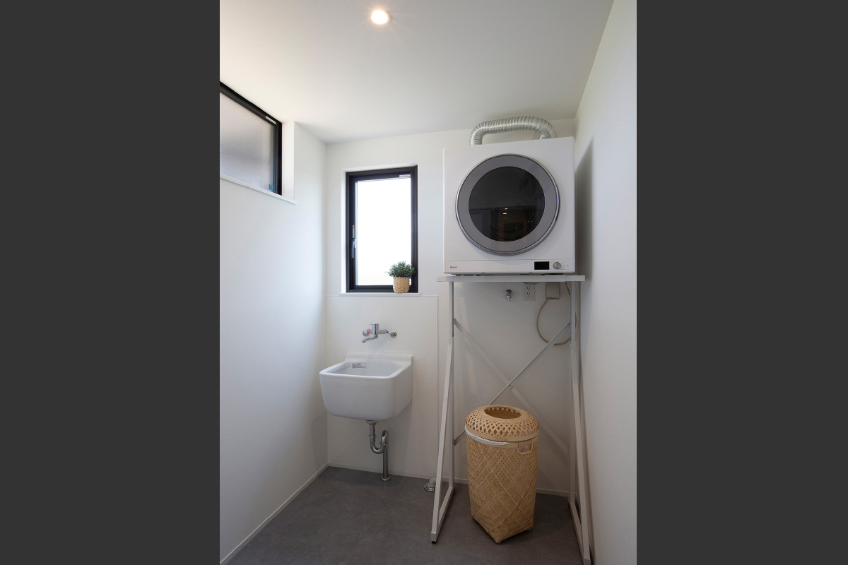 お風呂からサンルームを一直線につないだストレスフリーな家事動線。「乾太くん」も完備し梅雨の時期のタオルも毎日ふわふわに乾きます。