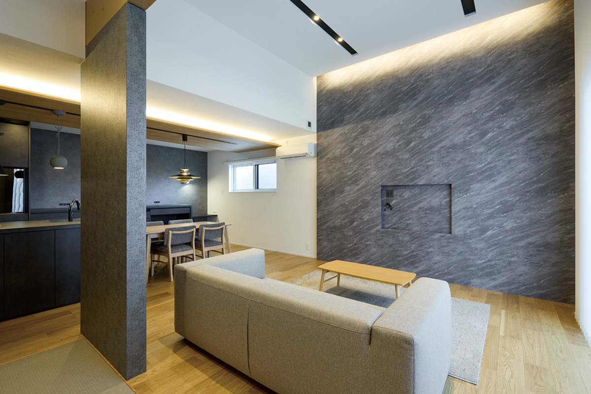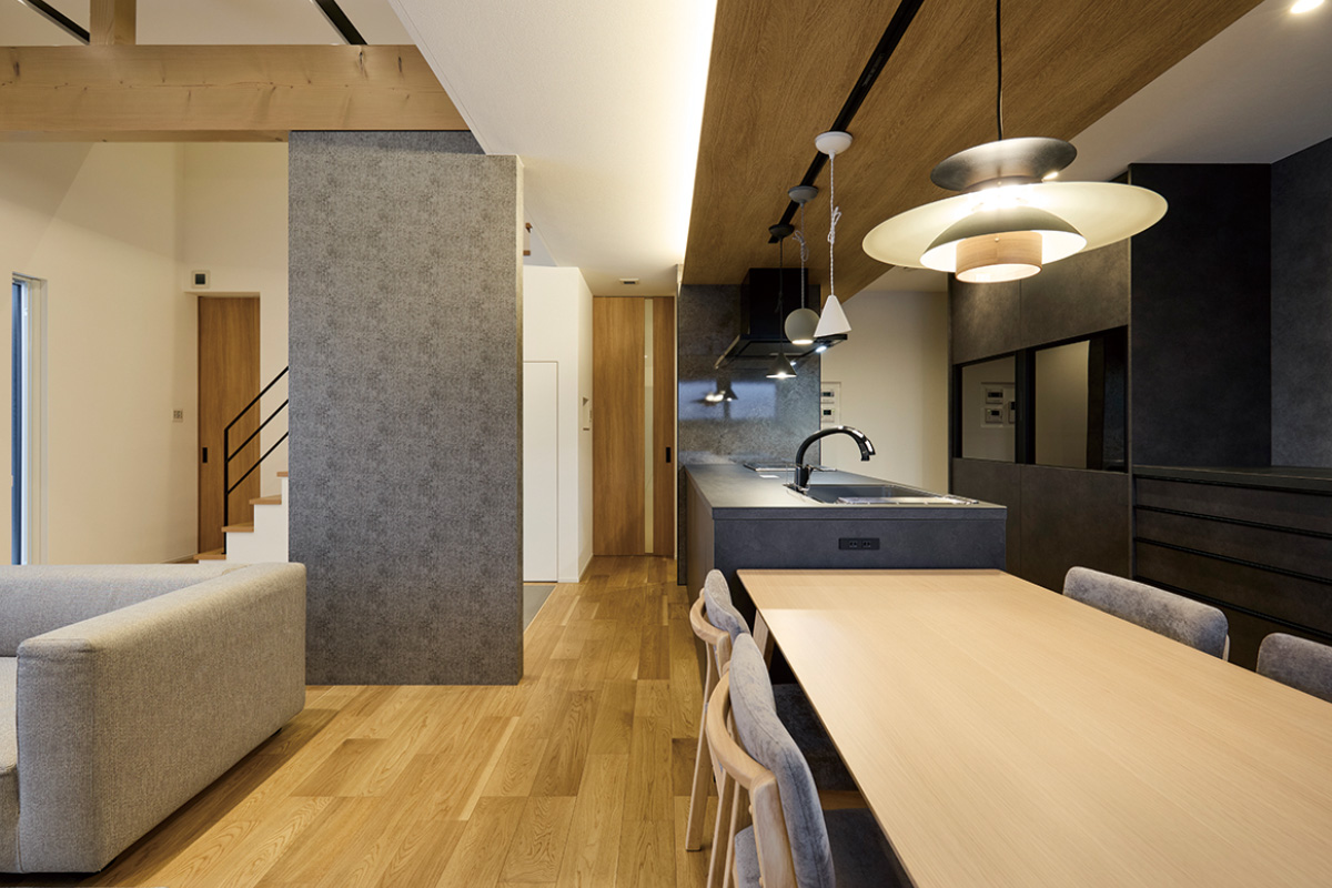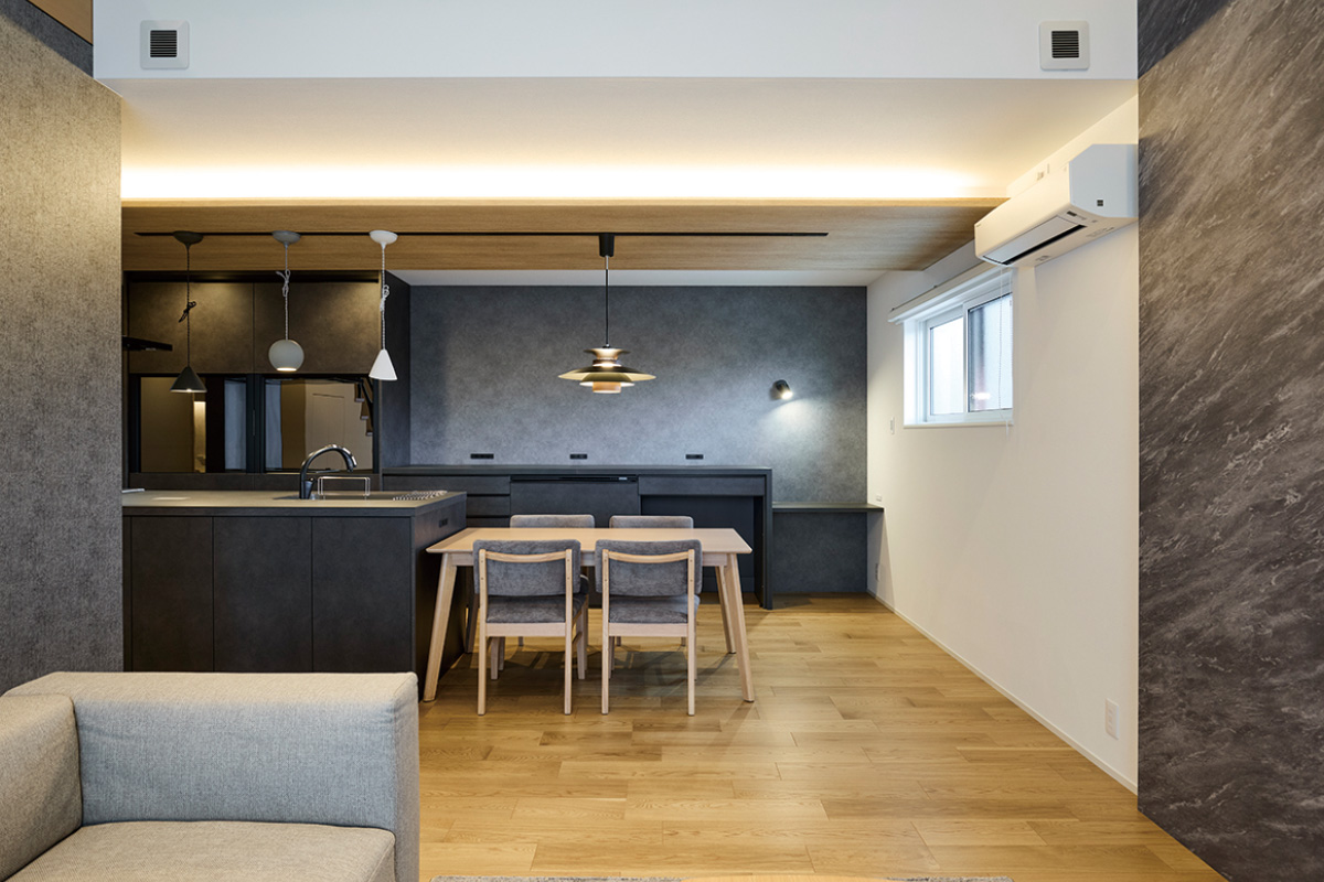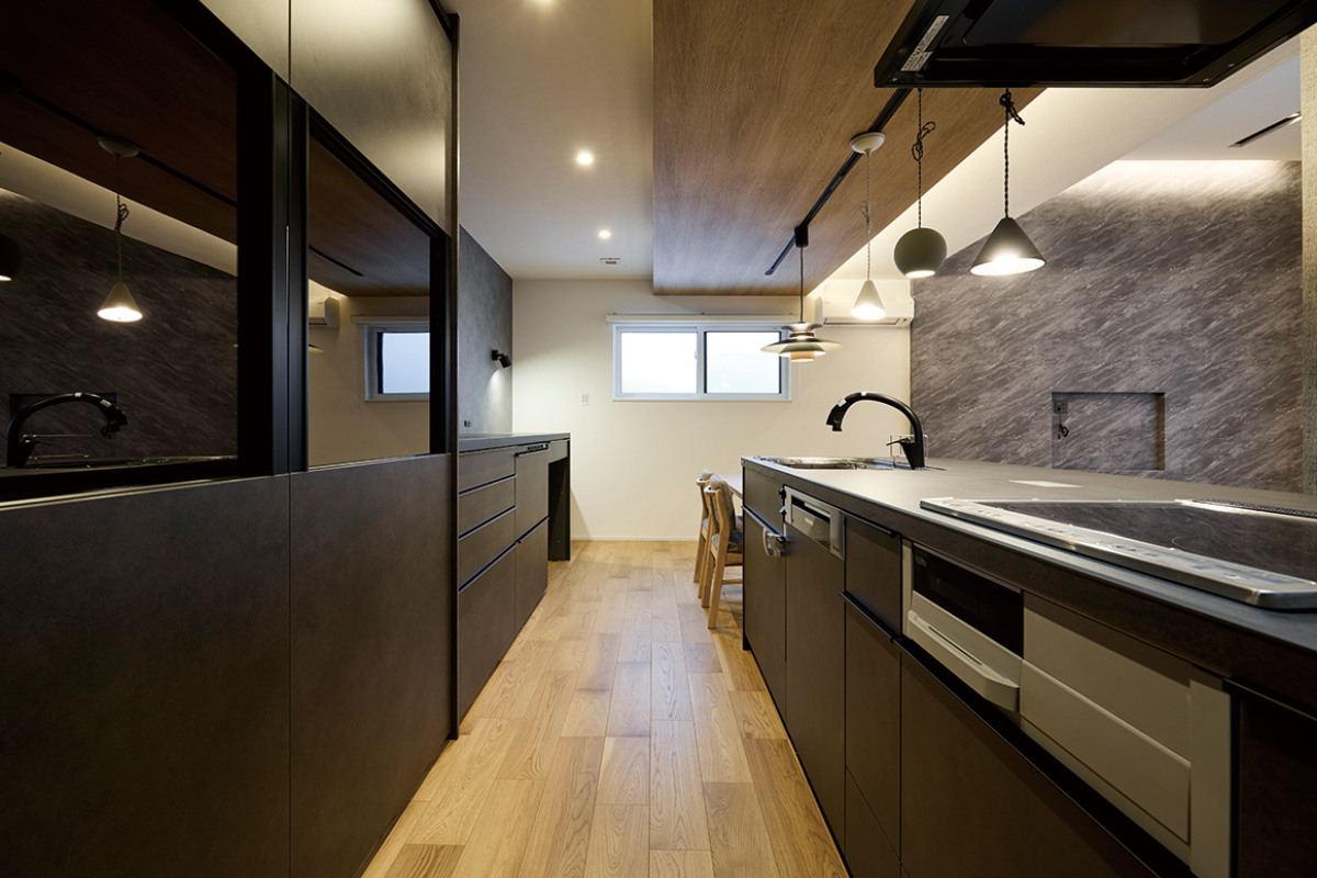 「セラミック天板」の色合いをベースに「カッコよさ」あふれるキッチン周りのデザインに統一。