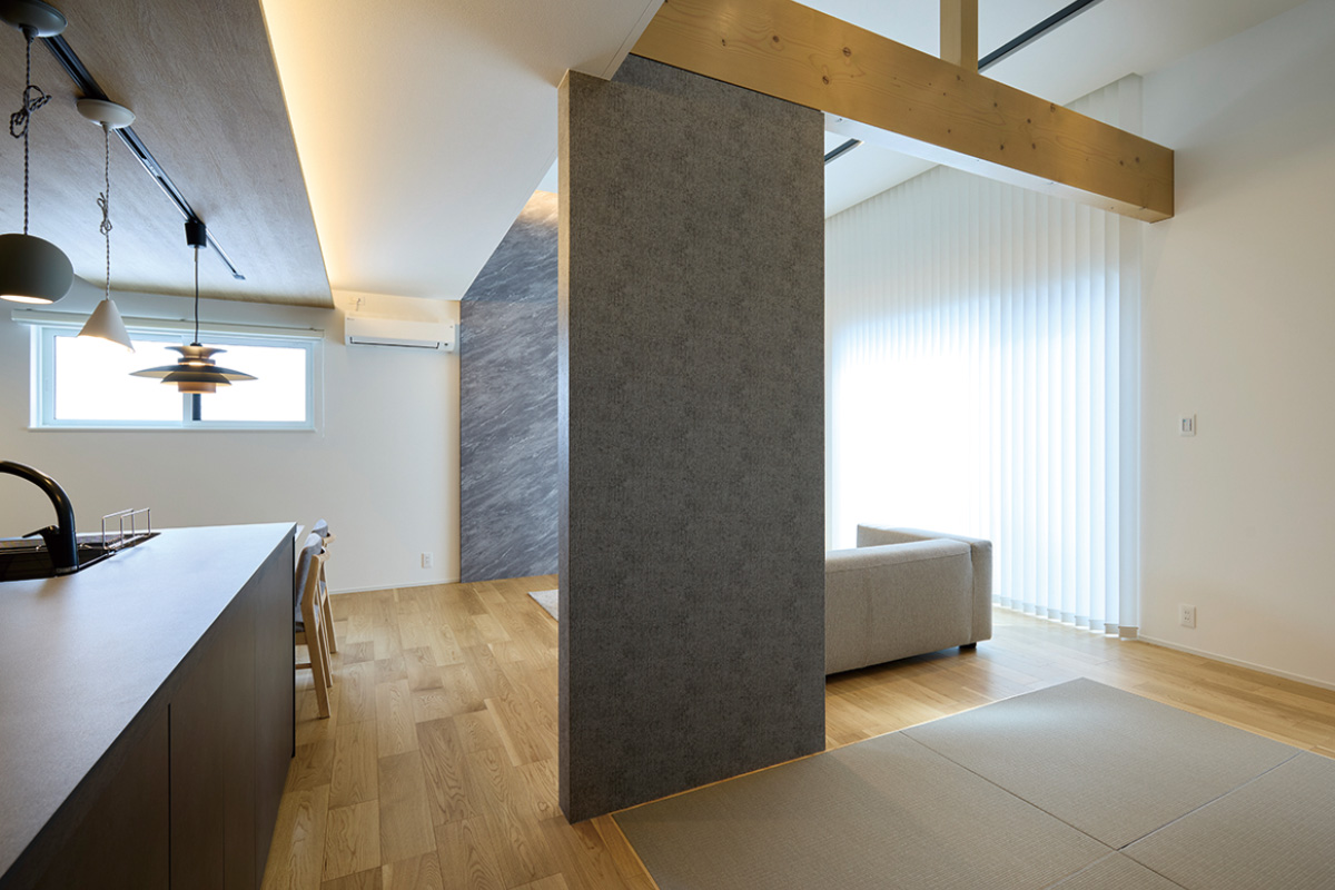 LDKは大空間の高天井リビングと隣接する畳コーナーで広がりを感じさせます。