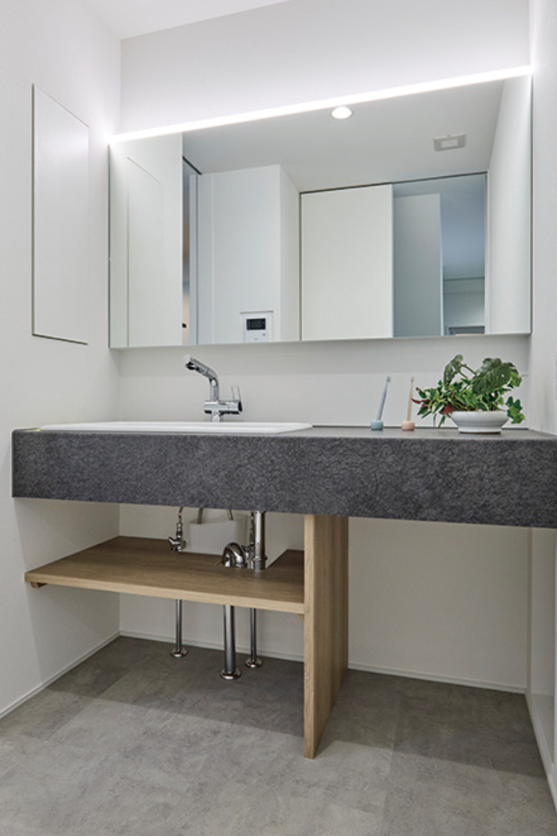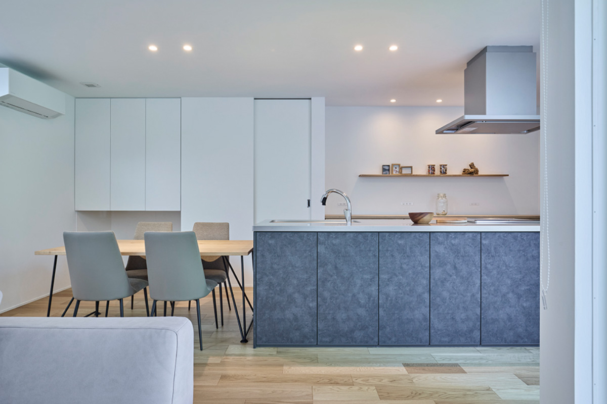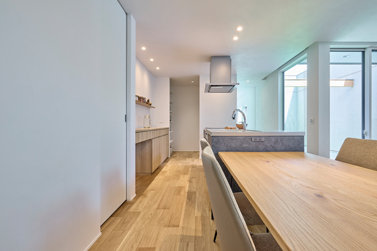 家具が映えるシンプルで細部にこだわった上質なデザイン高さの低い巾木や神谷建具、集光タイプの照明を採用しノイズレスな空間と質感を叶えたお家。