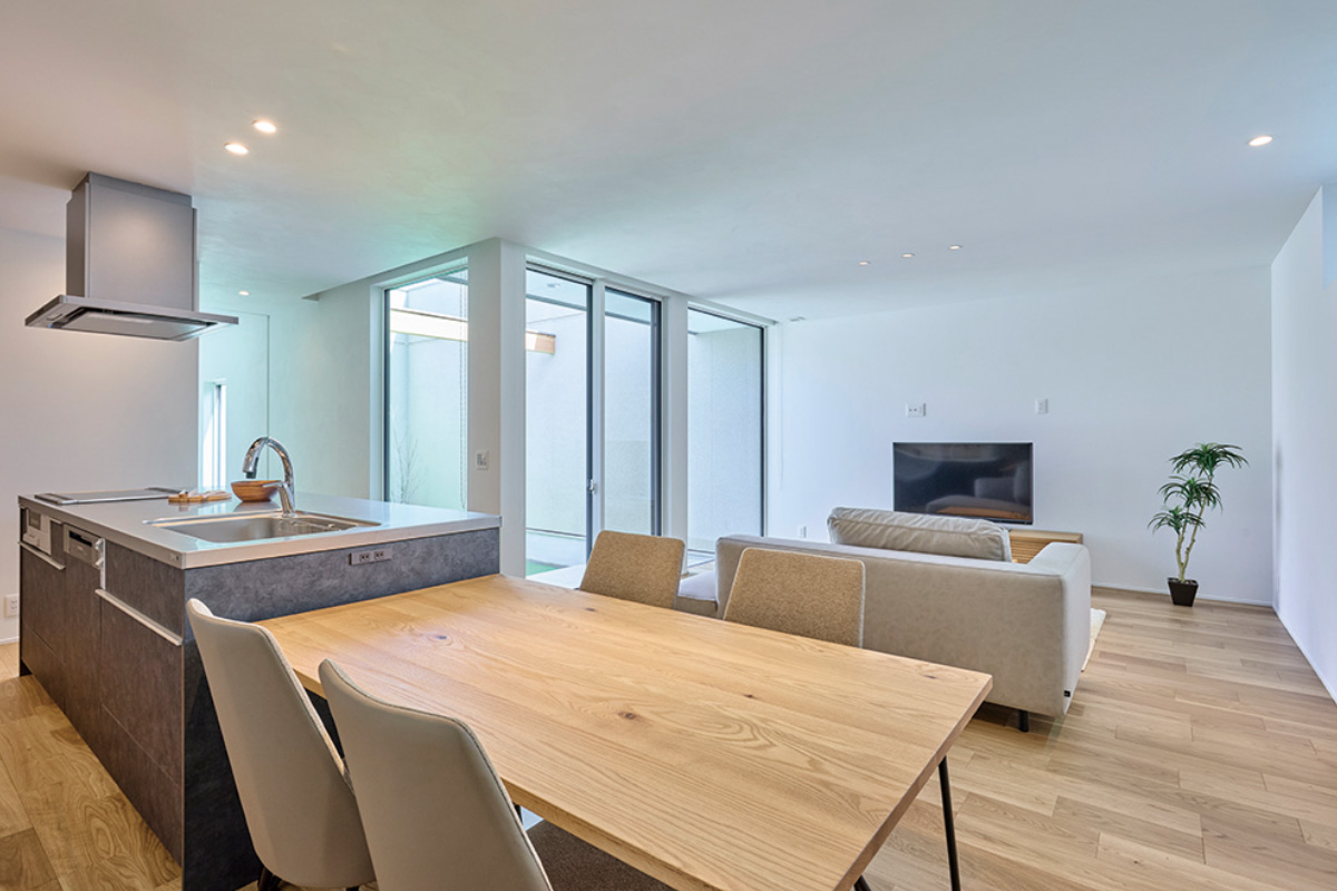 1階LDKは外から中が見えない外構一体型住宅大きな窓で開放的に生活したいとの要望があり、実現するために優れた断熱性・遮音効果を発揮する全窓リクシルのトリプルガラスを採用。