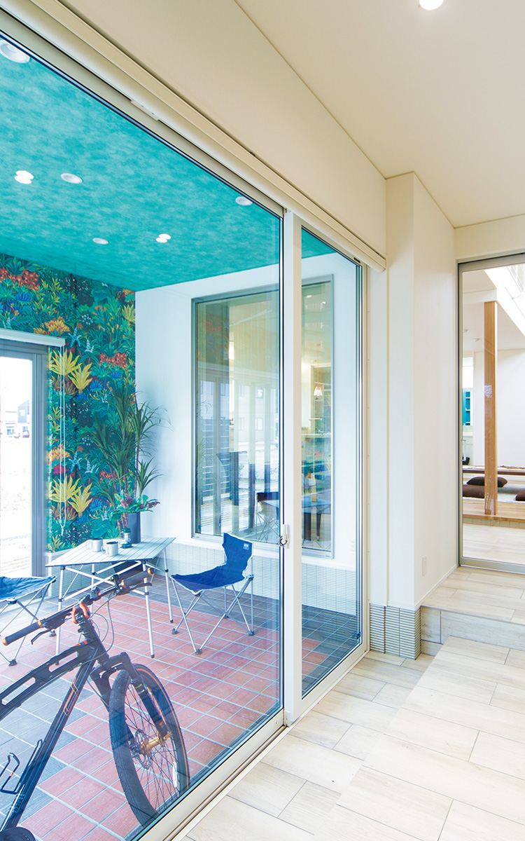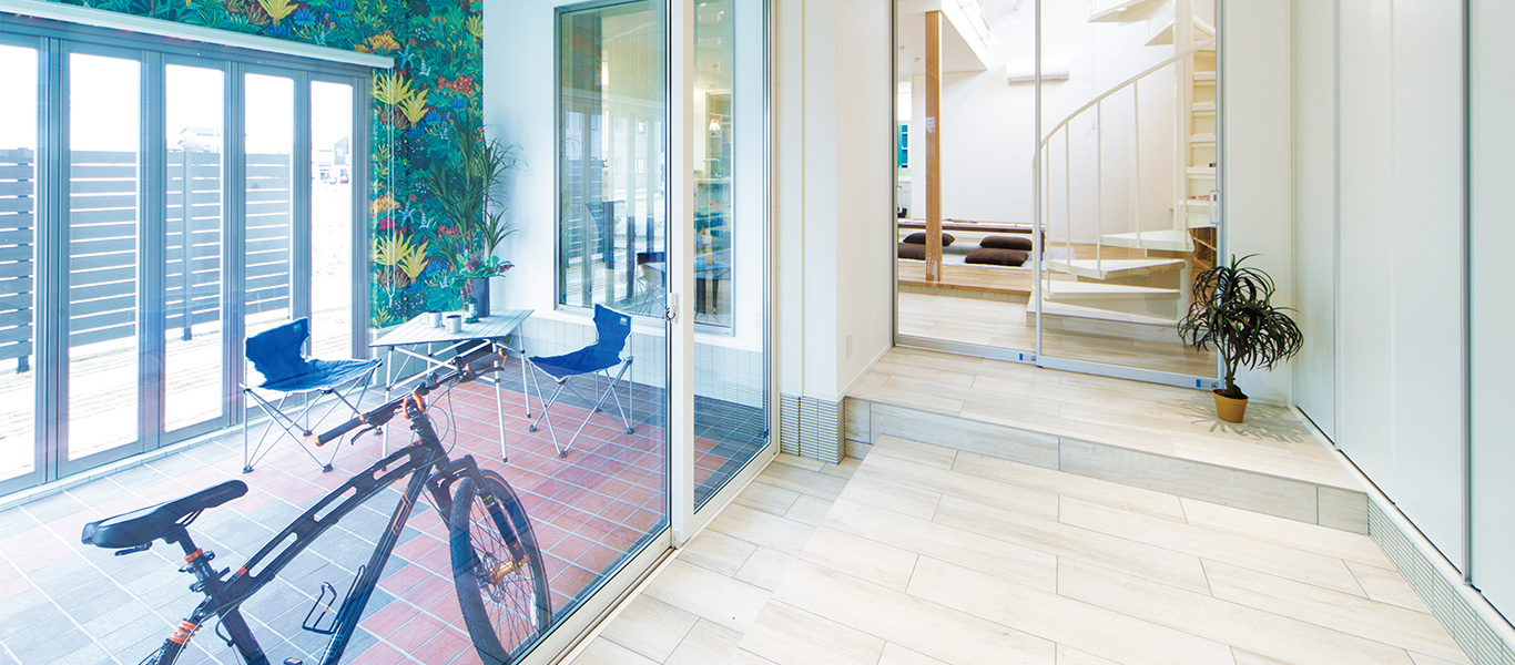 ご主人様のガレージスペース、奥様のリラックススペース、そして、お二人のサンクンリビング、日々の生活に趣味スペースが融合する事で建物のいろんな所でほっとする見所満載、そして、居心地満載な建物です。