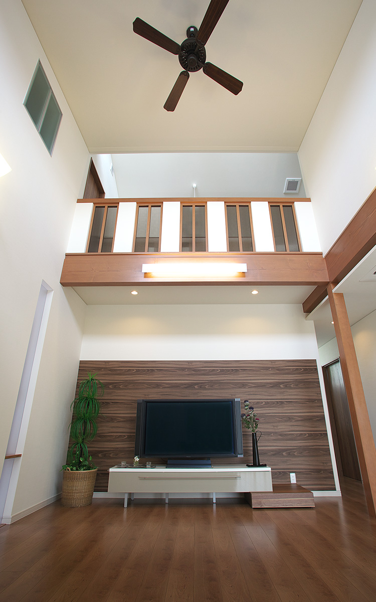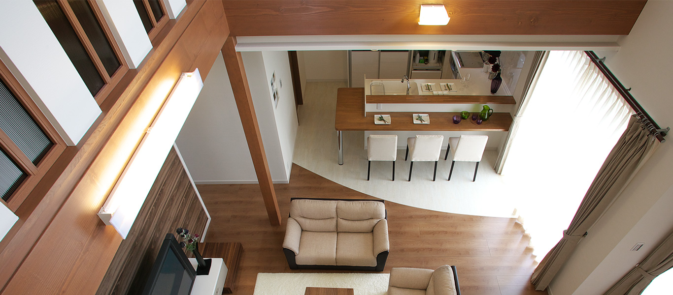 吹き抜けの大空間リビング+中庭のオーニング・テラス