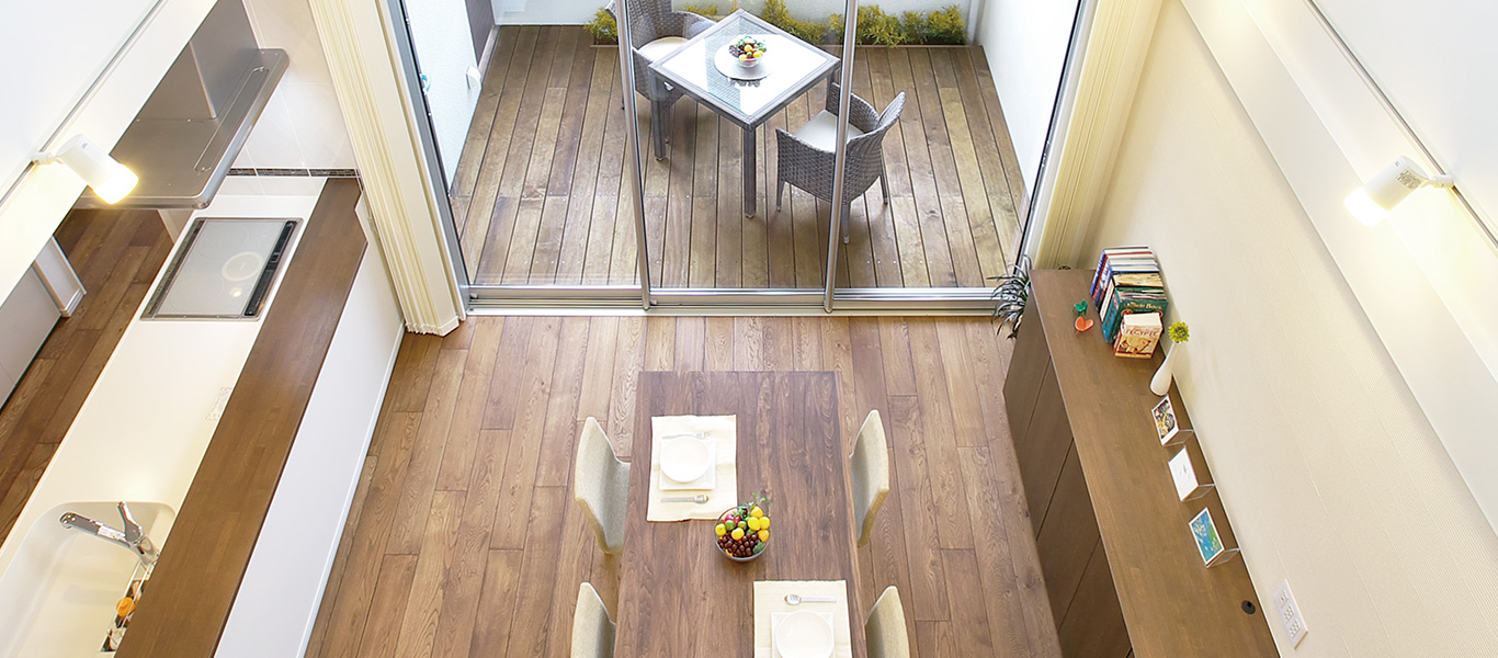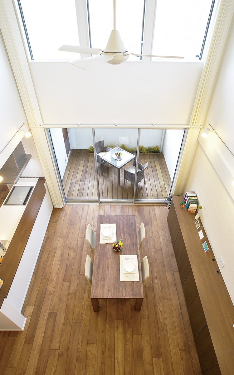 ・方角、立地状況を踏まえたゾーニング、窓の配置で開放感ある勾配高天井LDKになっています。