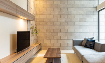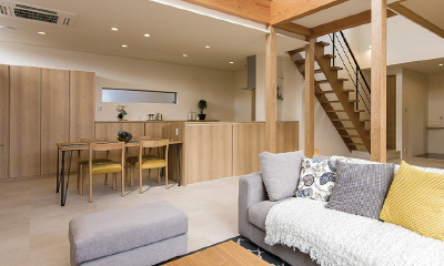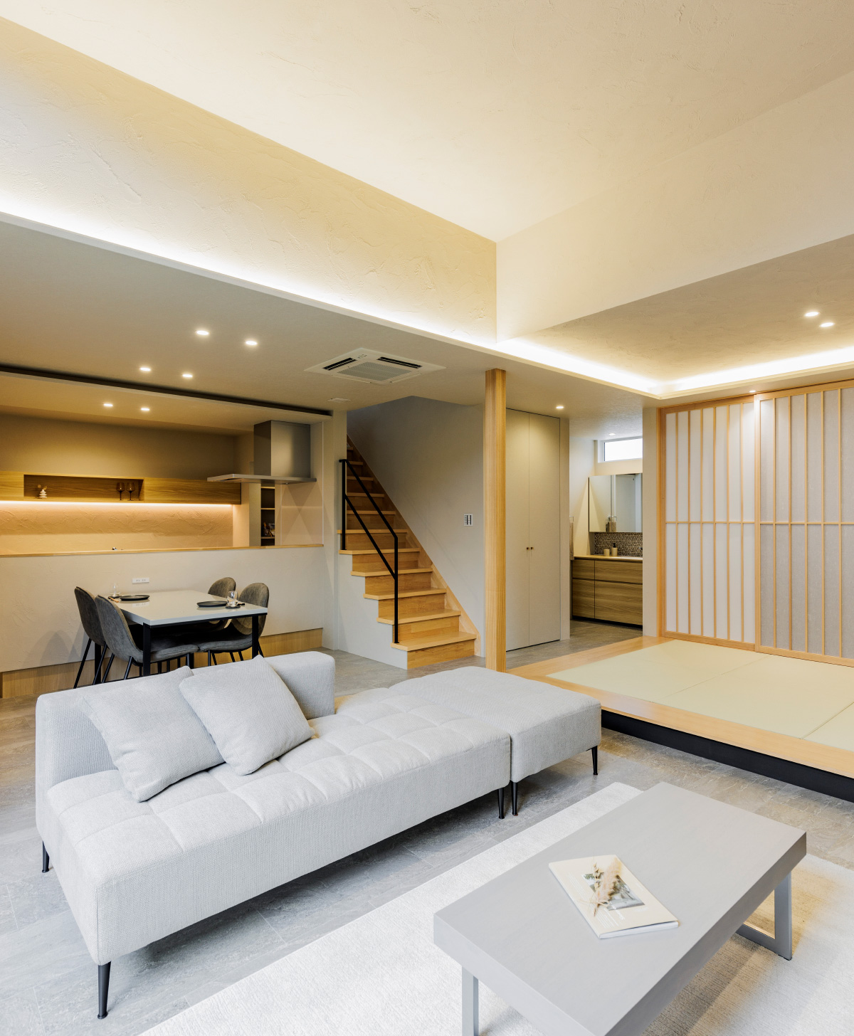 キッチンからパントリーや物干しスペース、洗面所などをつなぐ家事動線と玄関、シューズクローゼット、トイレなどの生活動線を区別。目的に応じて整えたストレスフリーな動線が忙しい日々にゆとりを生み出します。2つの動線の基点となるリビングは、ナチュラルなオーク調の木目をふんだんに用いた明るい雰囲気。珪藻土で仕上げた壁やリーフグリーンの畳が醸し出す和のあたたかみに間接照明のやわらかな光が加わり、家族はもちろん訪れたゲストも上質なくつろぎで包みます。床は大判の石目調タイルとし、すっきりと清潔な印象をプラス。フロアタイルや畳はデザイン性だけでなく調湿や傷への強さといった機能面も満たす素材を厳選し、末永い快適を形にしました。
