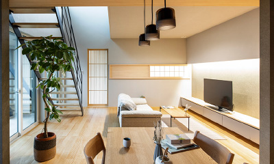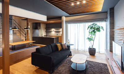 天井の高いリビングから一直線に配したダイニングやキッチン、小上がり式の畳コーナー、さらに庭やテラスといった外部空間へも上下左右に視線がのびるつくり。空間につながりを持たせることで帖数だけでは測れない、広さと解放感を生み出しています。
