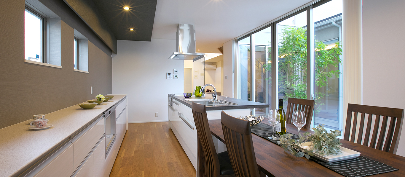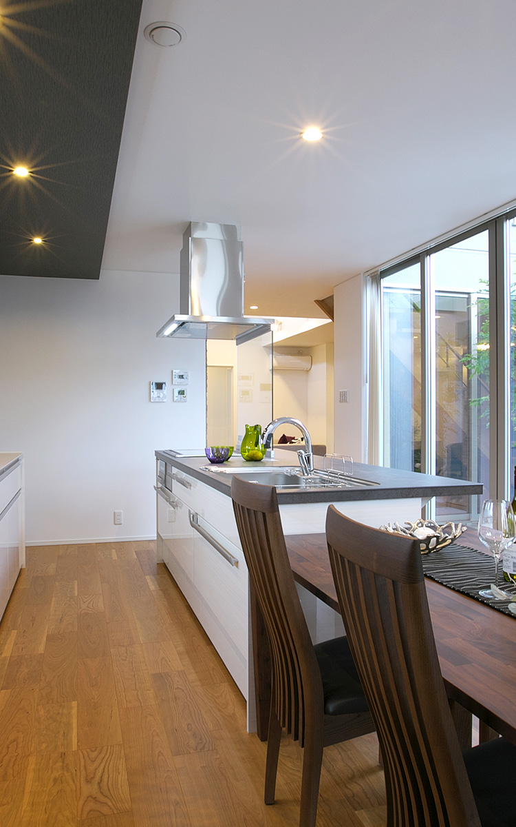 約4mの高天井に薪ストーブが設置されたリビングは4方向から光が注ぎ、スタジオ感覚のキッチンは家族や友人たちとのにぎわいが想像できます。外部からの視線をさえぎる中庭や外観デザインはくつろぎ空間の演出につながります。