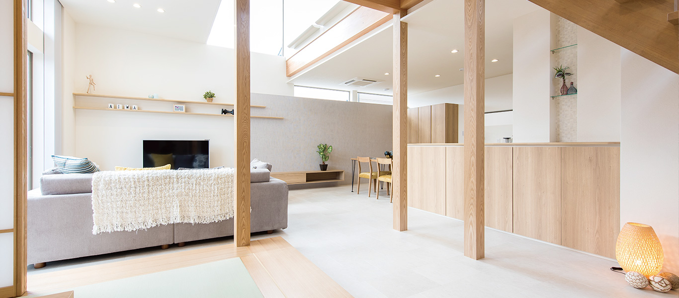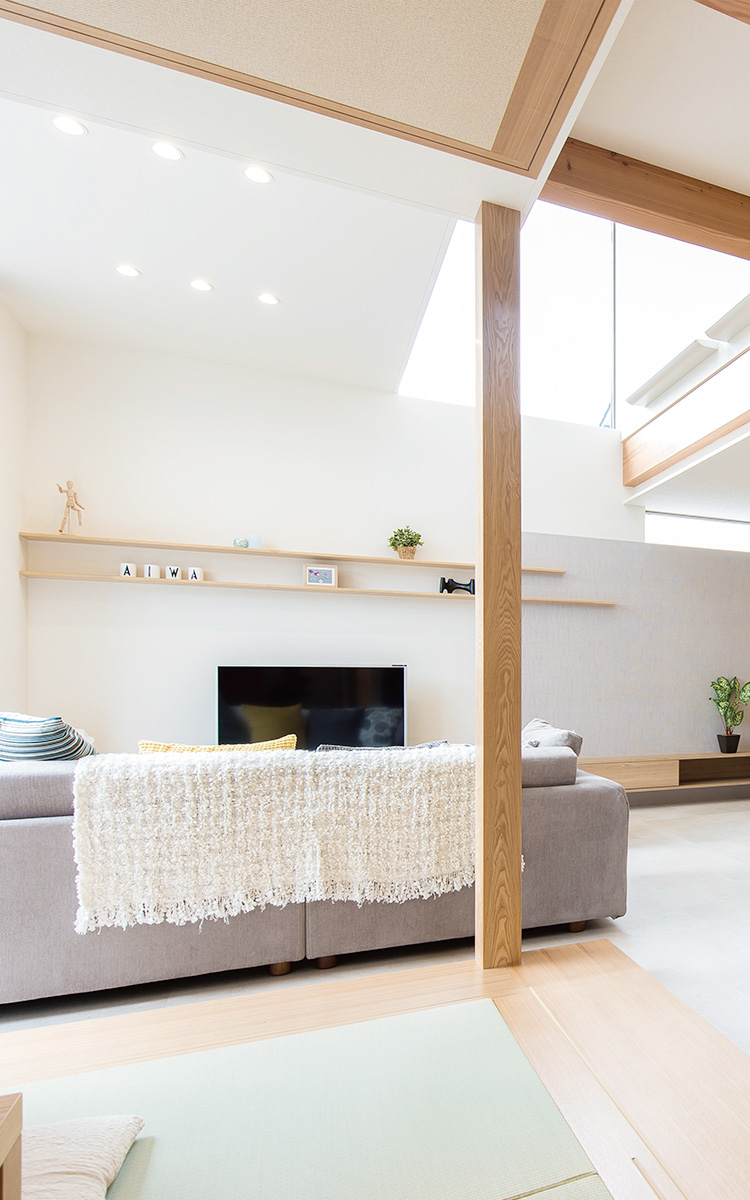 67坪の敷地の中に、お施主様のご要望をぎゅっと詰め込んだ、生活しやすいお住まいです。一番の見所は、3.5mの高天井を設けたLDKです。解放感はもちろんのこと、上部からの採光で明るさを感じます。