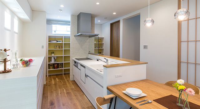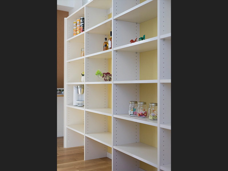 キッチンを中心にパントリーや水回りを集約し、一直線に配置。こうすることで廊下を省くことができスペースを効率的に使うことができます。そして何より、家事動線を短くし時間と心の余裕を生みだします。