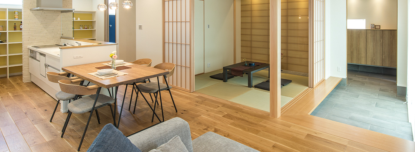 住まいの印象を高める門扉のある外観、常に明るさを確保しながらも直射日光や外部からの視線をさえぎる間取り、障子の丸窓などふと目に入るだけで心を和ませる和の趣。家族の数だけある、理想の生活をより豊かで楽しくする提案を随所に取り入れました。見て分かる、住んで実感する本当の心地よさがここにあります。