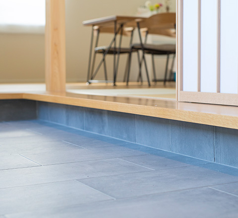リビングに直接出入りできる土縁は、室内、屋外どちらの感覚でも使える伸びやかなスペース。