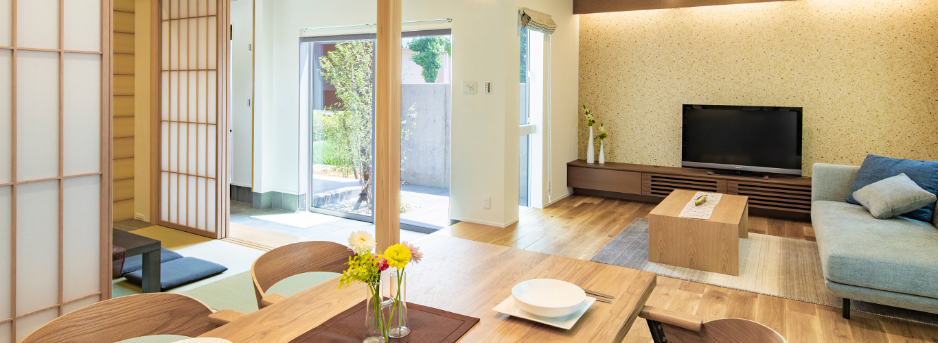 住まいの印象を高める門扉のある外観、常に明るさを確保しながらも直射日光や外部からの視線をさえぎる間取り、障子の丸窓などふと目に入るだけで心を和ませる和の趣。家族の数だけある、理想の生活をより豊かで楽しくする提案を随所に取り入れました。見て分かる、住んで実感する本当の心地よさがここにあります。