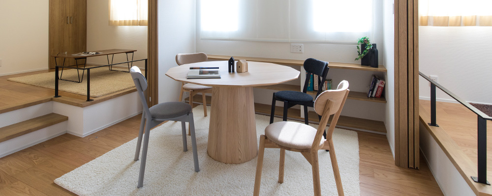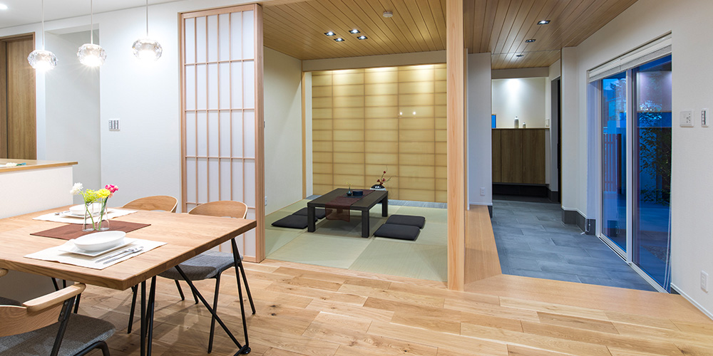 扉を開け放つと和室から土縁まで一体となるリビングは、吹き抜けとはひと味違った開放感を体感できる場所。家族の成長に合わせて使い方を変えられるファミリールームをはじめ、各空間には多様化する現代の暮らしを支える柔軟性と快適性、そして和のしつらいを取り入れ、誰もがほっと落ち着ける住まいを実現しました。