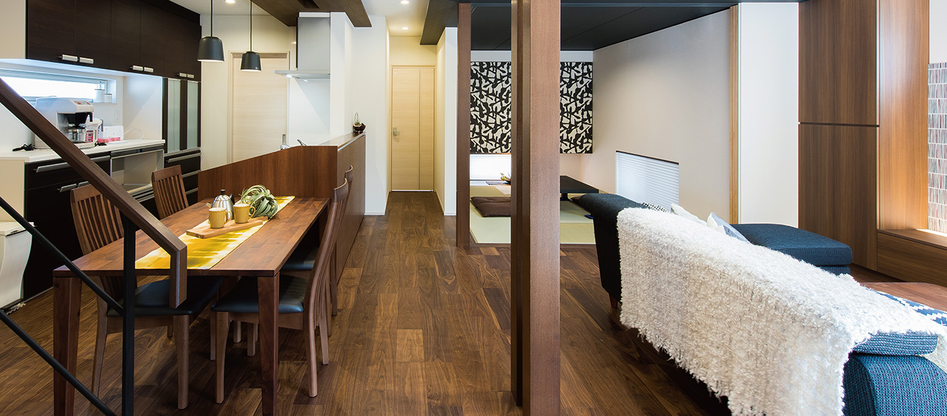 開放的で明るいリビング。そこから繋がるテラスは外界からの目線を遮る設計です。また、ユーザビリティの高さや、ゾーニングの工夫など、注文住宅ならではの魅力がたっぷり詰まっています。