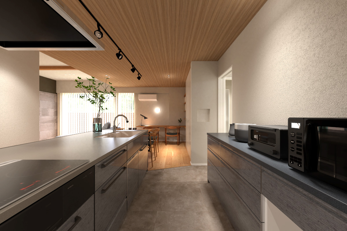 ペニンシュラ型キッチン全体を見渡せるように配置し、キッチンの背面収納付き・パントリー収納を経由した動線、海外製食洗機ボッシュ、浄水機能付きタッチレス水栓、ホーローパネルなど使い勝手と機能性を持たせました。