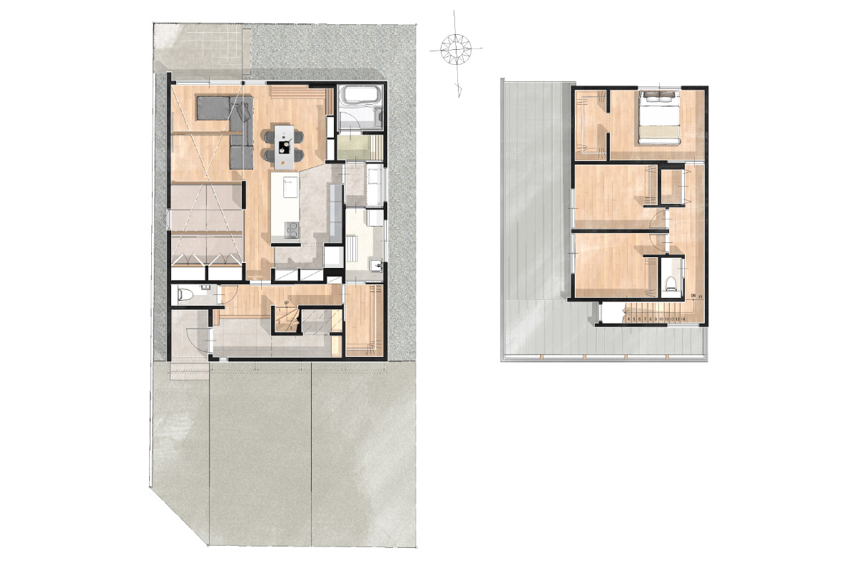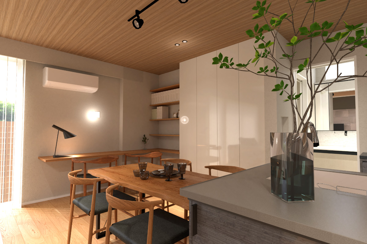 打ち合わせの最中でも、具体的に収納したい物をリストアップし、いかに使いやすくスッキリと見える収納計画にするか、そして毎日行う家事の効率化を考えて間取りを構成しました。また、子供との距離感を適度に保ったLDK空間は自然とコミュニケーションが生まれ、【家族時間を大切に】という想いを込めたお家です。