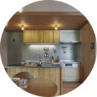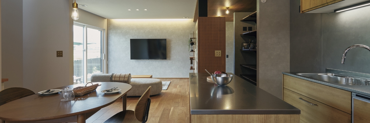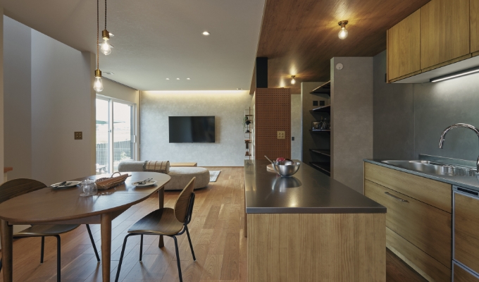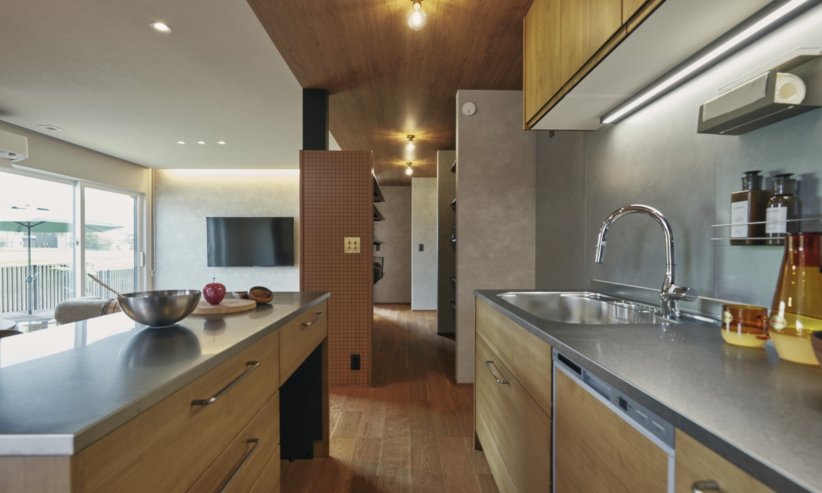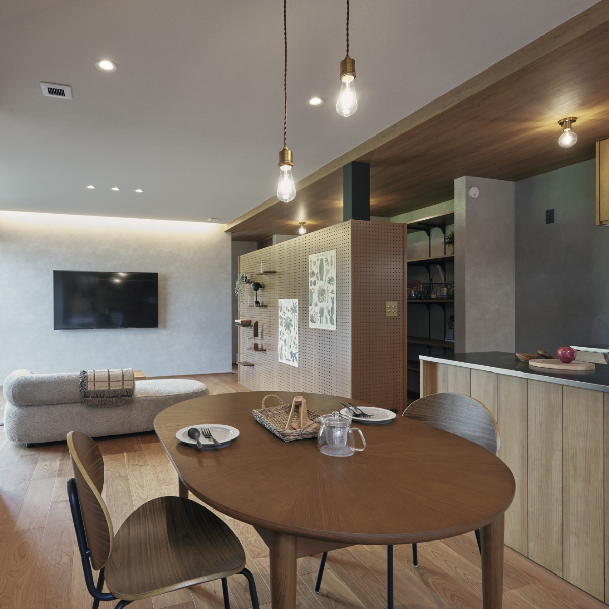 玄関を開ければ、家族の笑顔とあたたかな空間が迎えてくれる、帰宅が楽しみになる家です。室内に一歩足を踏み入れると、たっぷりの光が降りそそぐ吹き抜けの土間を軸に、家の内と外、そして室内全体がつながっているような開放感と一体感に包まれます。土間の壁は一面有孔ボードとなっており、収納をつくったり、季節の飾り付けをしたり、家族の「今」に合わせてアレンジできる自在な空間。また、土間はキッチンやリビングと仕切りなしでつながっており、外出や帰宅時にコミュニケーションがとりやすいことも魅力です。シンプルな間取りで空間の無駄をそぎ落とし、壁紙なども標準仕様とする一方で、カウンター付きの二面キッチンや大型のパントリー、ペットのケガを防ぐ床材など、家族の快適や安心には費用をかける予算配分のバランスも一見の価値がある住まいです。