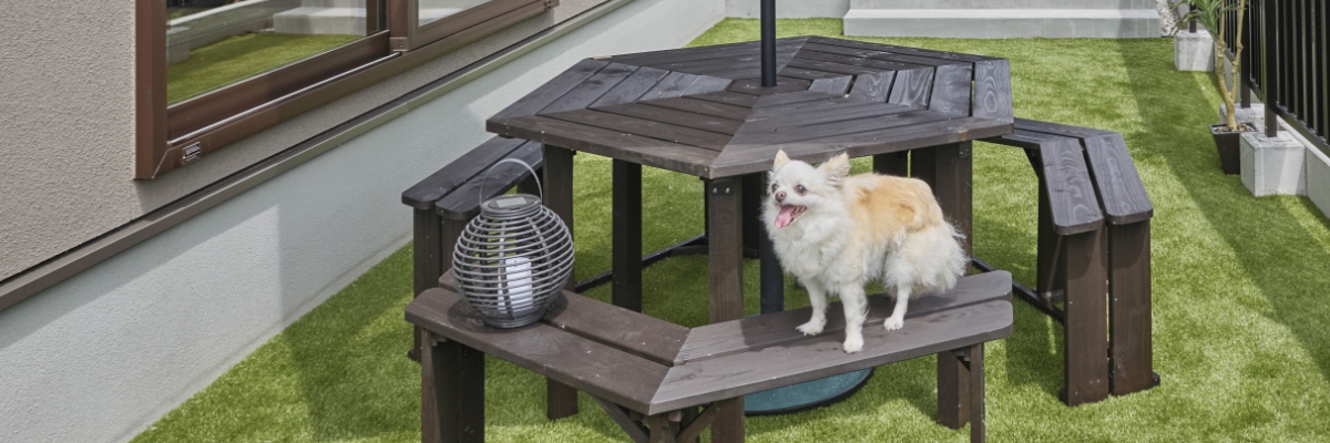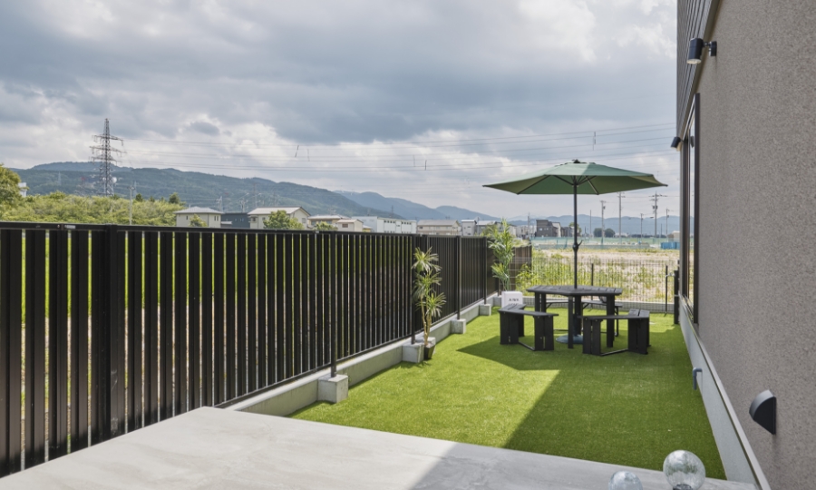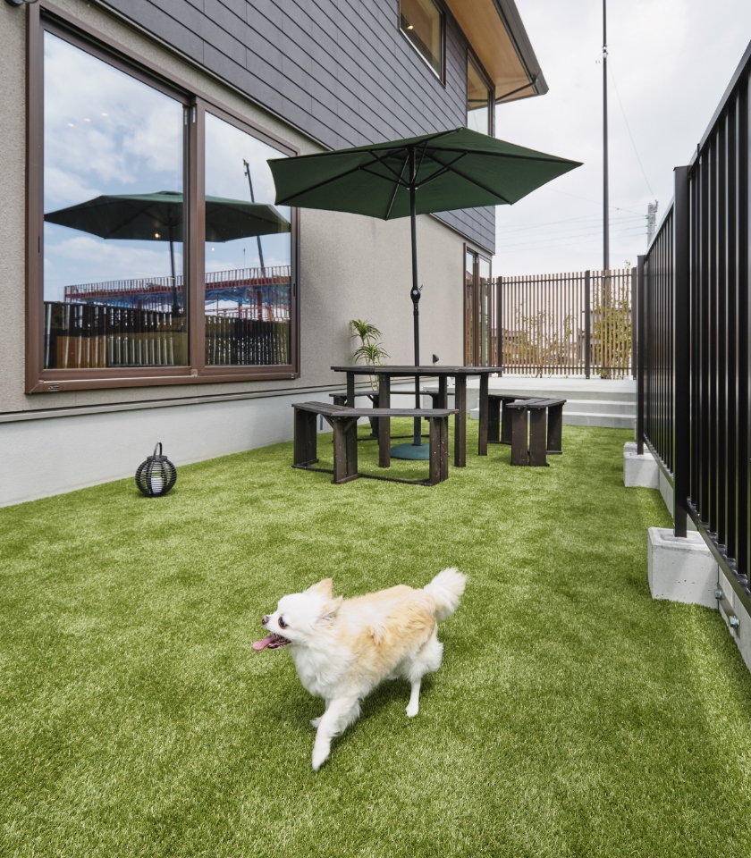 人工芝を敷いた庭は、ペットと走り回れるアウトドアリビングも兼ねています。日当たりや風通しを確保するほか、土間から直接出入りできるため、ホームパーティなど人を招く場としても便利です。
