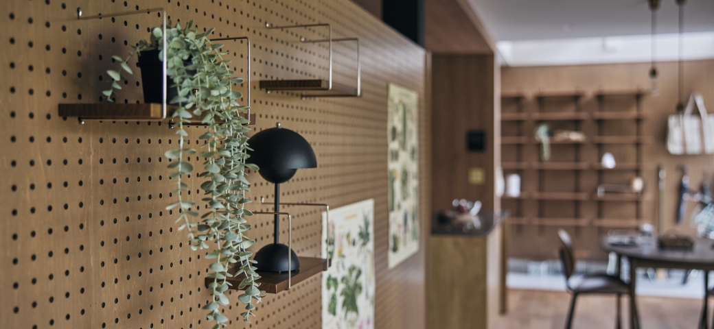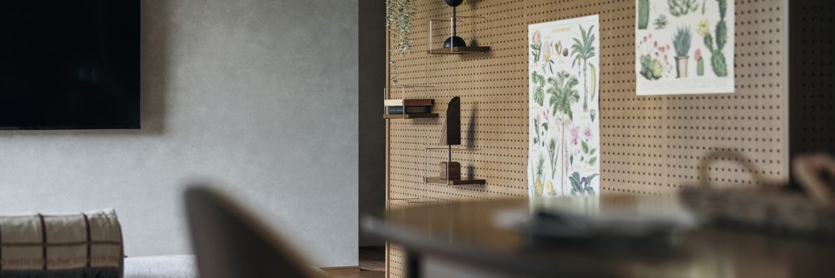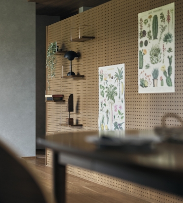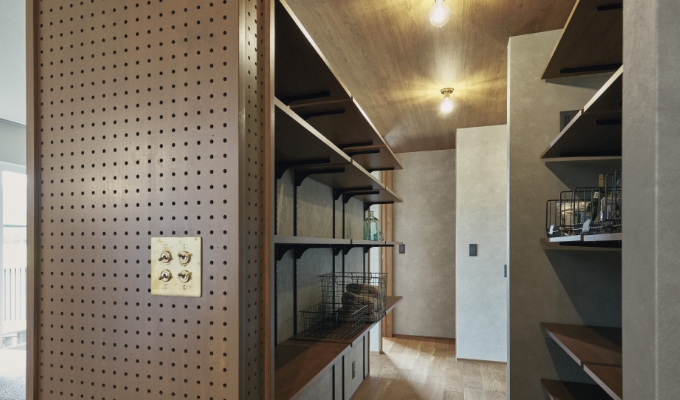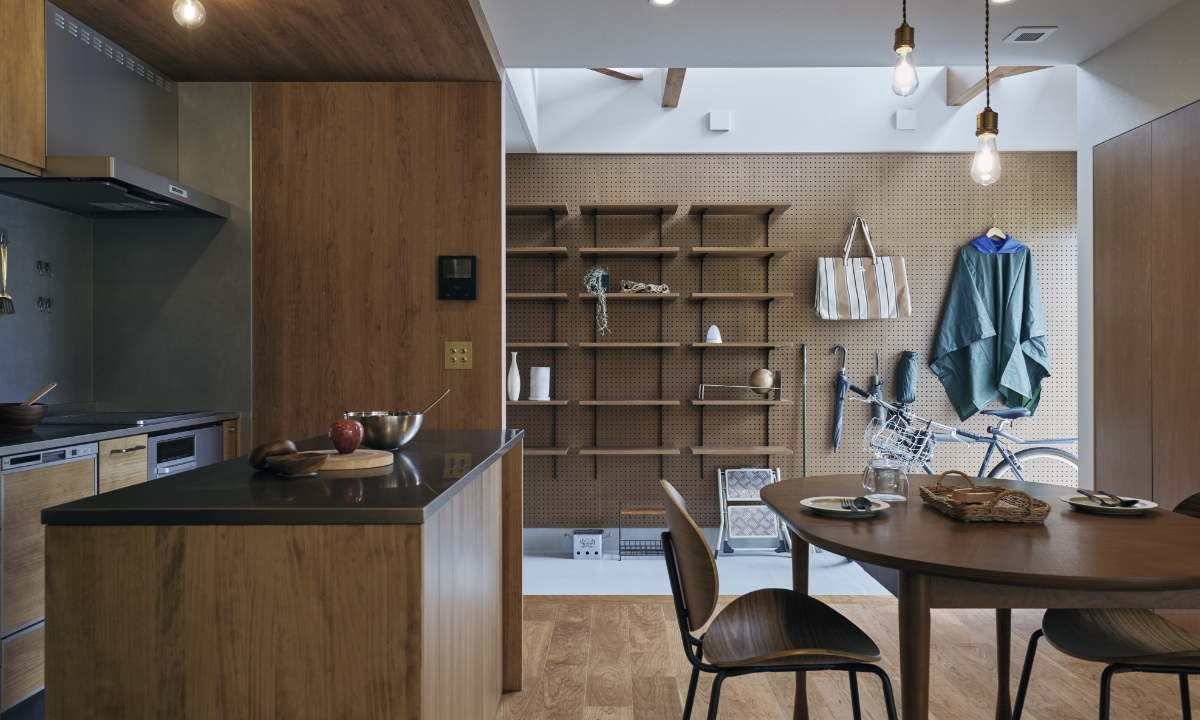 土間やリビングの壁を一面有孔ボードとし、多様な使い勝手を実現。壁面収納をDIYしたり、思い思いに飾ったり。家族の好みや成長に合わせて空間をアレンジする楽しみが生活に潤いをもたらします。