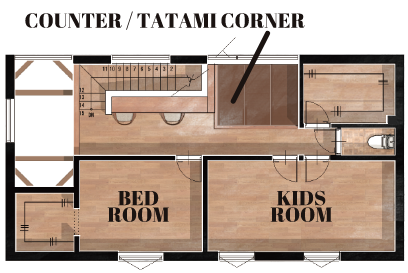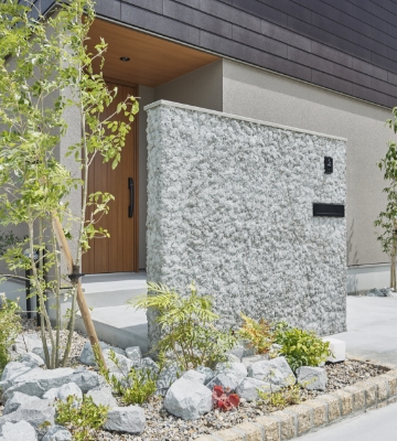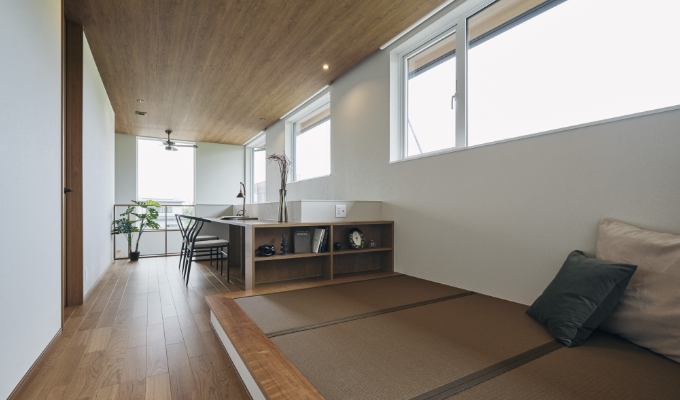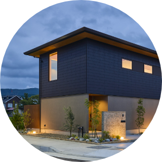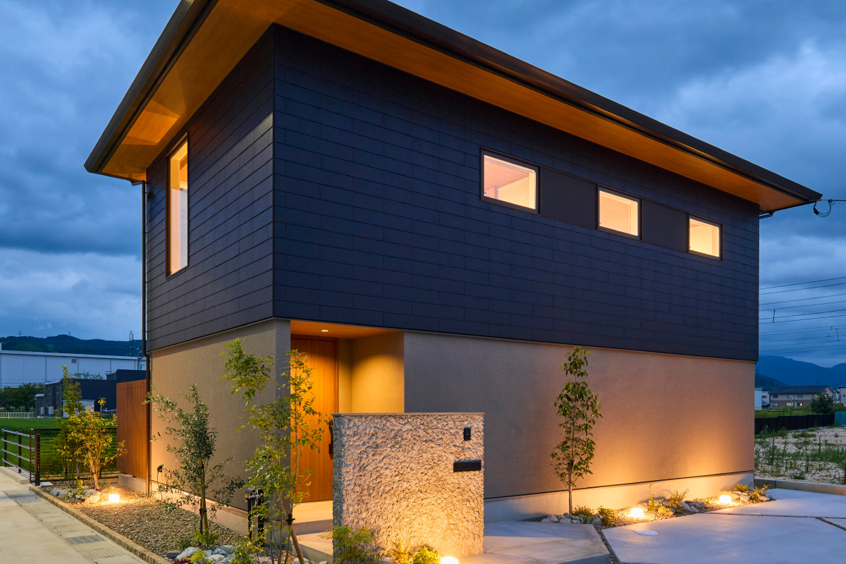 2階の個室は広さを抑え、そのぶん階段上の吹き抜けとつながる空間に、親子で共有できるワークコーナーや畳スペースを設置。リビングとは異なる空間が、家族に新たなくつろぎをもたらします。主寝室にはウォークインクローゼット、フロア奥には大容量のファミリークローゼットを完備。仕事に子育てにと忙しい中でも、すっきりと暮らせる収納力を確保しました。外観は深い軒と木目で高級感を演出。さらに、幅の細い板を重ね張りしたラップサイディングがつくりだす印影をスポットライトがドラマチックに照らしだし、何年たっても帰りたいと思えるわが家であり続けます。