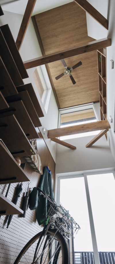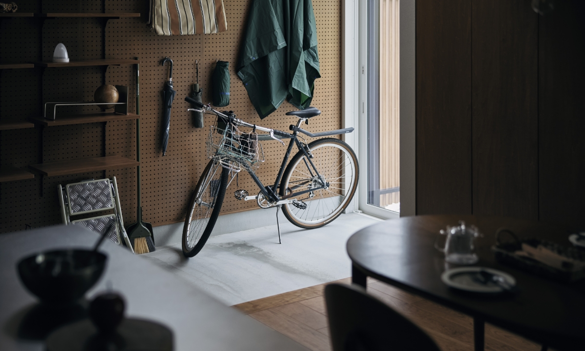 玄関と庭をつなぐ土間は、アイデア次第でいかようにも使える広さ。自転車やベビーカー置き場、トレーニングスペース、リビングの延長など、お家時間をさらに充実させる可能性を秘めています。