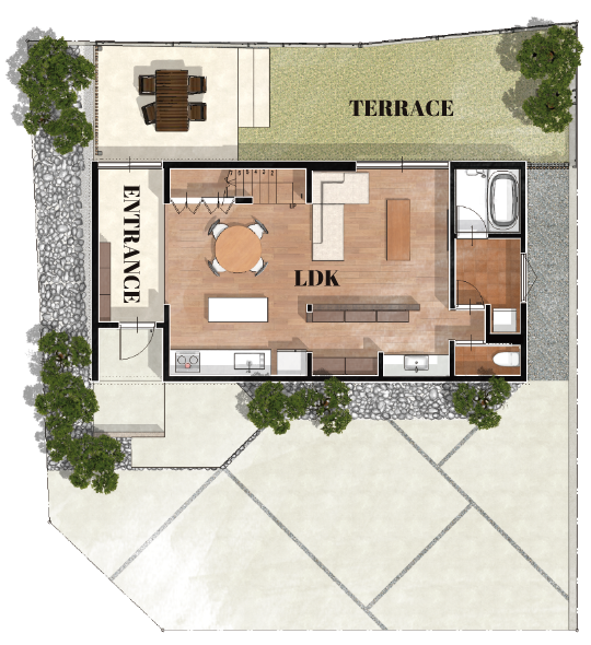 仕切りを極力なくすことで、キッチンからリビング、パントリーへの家事動線もスムーズに。風呂や洗濯スペースなど人目が気になる空間はリビング奥にまとめて配置し、開放的でありながらプライベートも守ります。