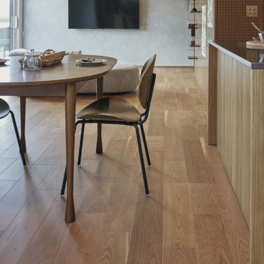 床や天井の木目は深みのあるチェリー系の色味で統一。水回りのコルク床やトグルスイッチ、照明など、細部のデザインがかもし出すレトロビンテージな雰囲気が、明るく広々とした空間に落ち着きを与えます。