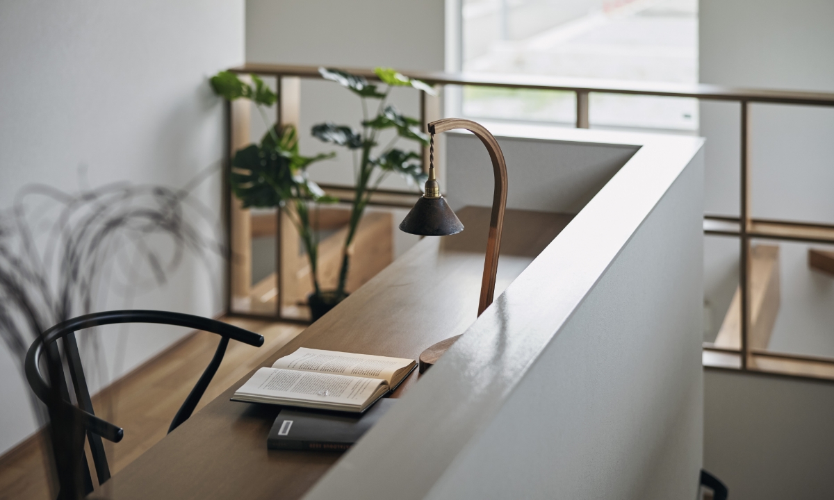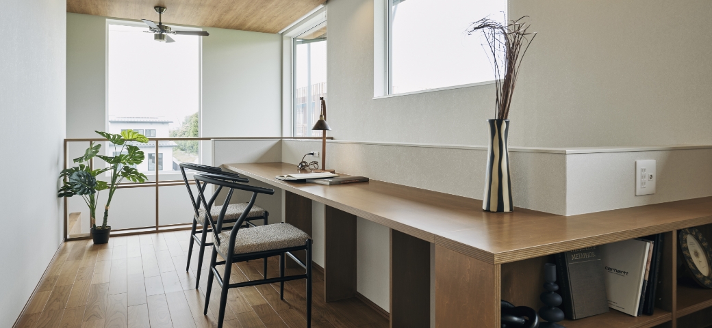 2階のワークコーナーには、木の質感を味わえるカウンターと本棚を造作。本来は下地とする集成材を使ってコストを抑える製作方法は、木を知り尽くしたアイワホームならではといえます。