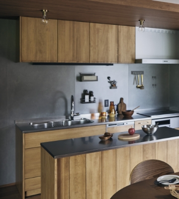 無垢の風合いが人気のウッドワン製キッチン。壁付けにすることで背面のカウンター周りはすっきり。正面はマグネットパネルになっており、壁面を調理小物などの収納スペースとして活用できます。