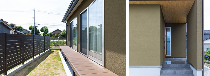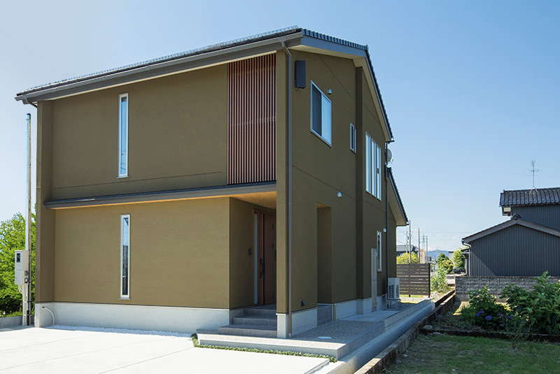 周囲との調和を考えながらライフスタイルに合わせたイメージを表現するものとして、外観デザインはとても大切です。住む人の感性を象徴する外装には流行の伝統色を使いました。すっきりとした現代的なデザインは飽きの来ない仕上がりになっています。和の要素を自然な形で取り入れた縦長の窓と格子が、ひときわ目をひきます。