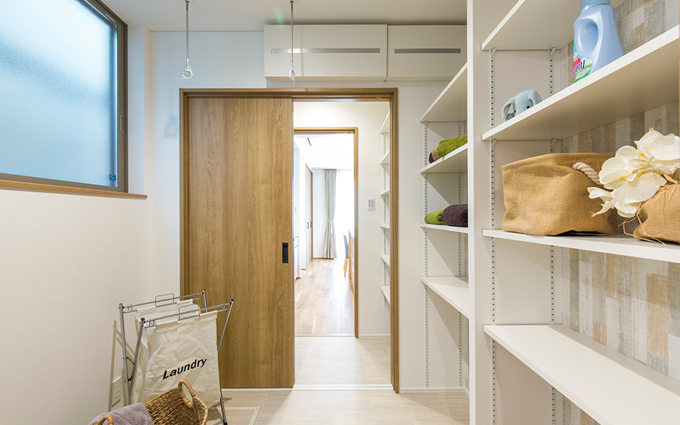 キッチン周りには、パントリーやサンルームをはじめ水回り関係をまとめました。これで、無駄な移動をしなくて良いコンパクトな家事動線になりました。