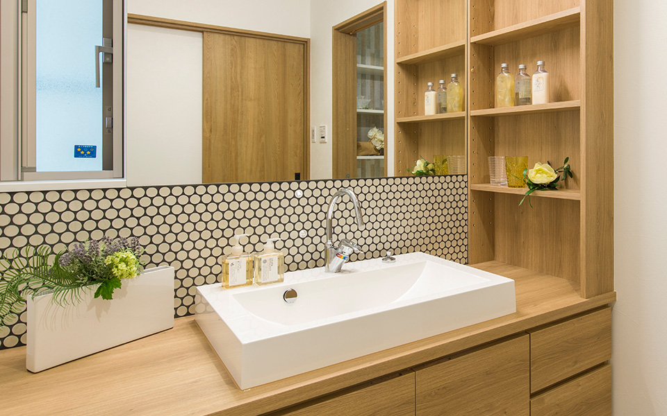 洗面台は造作にし、タイルを貼り1500幅のゆったりした洗面台にしました。これで、家族二人並んでもゆったり歯を磨けます。