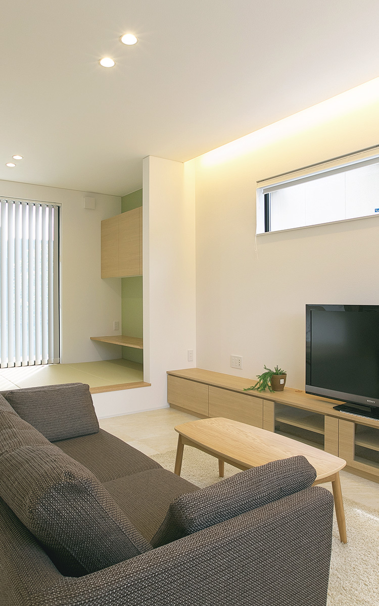 デザインにおいても外観は上品かつ存在感のあるBOX型の和モダンに仕上がっています。内観は高級床材、木格子を使用し木の風合いを上品に表現し、さらに機能面については太陽光発電システム、床暖房、制震ダンパー、樹脂サッシ、高気密断熱材などその他多数を採用しています。