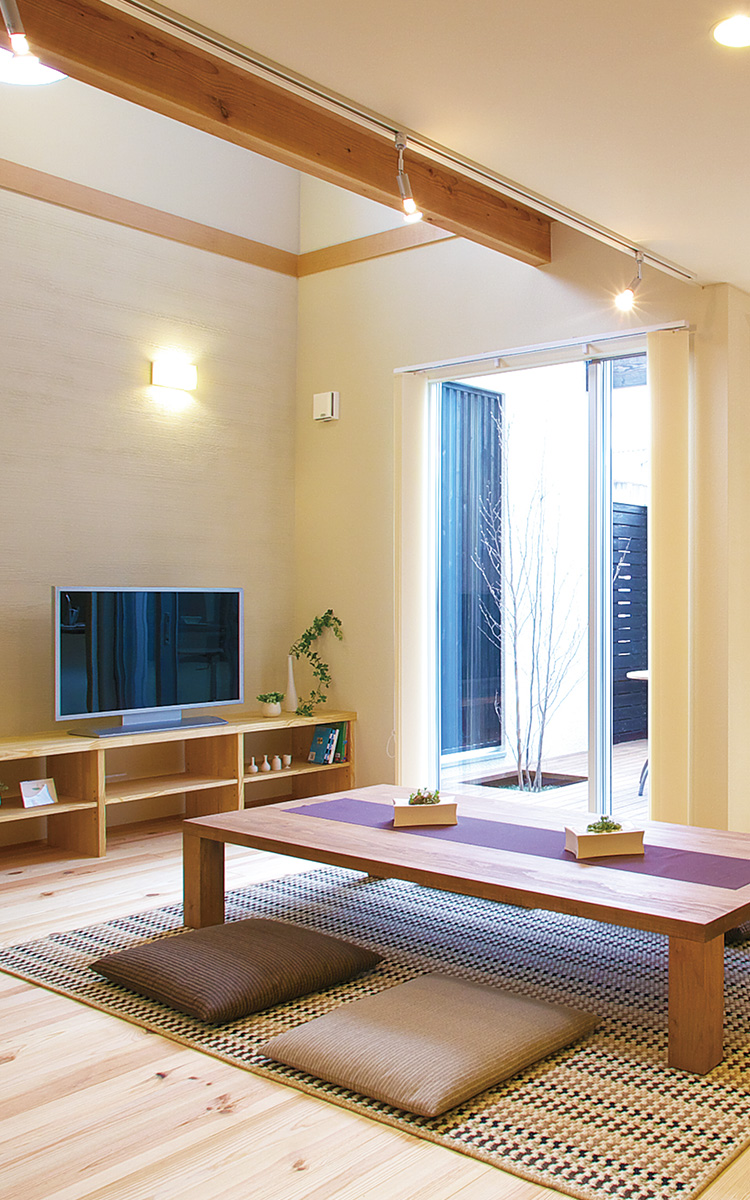 外観は通り沿いですので、壁をつくりプライバシーを確保しつつ、南西からの日差しがしっかり入るように工夫しています。内観は無垢の床材を用いてナチュラルスタイルに仕上げました。
