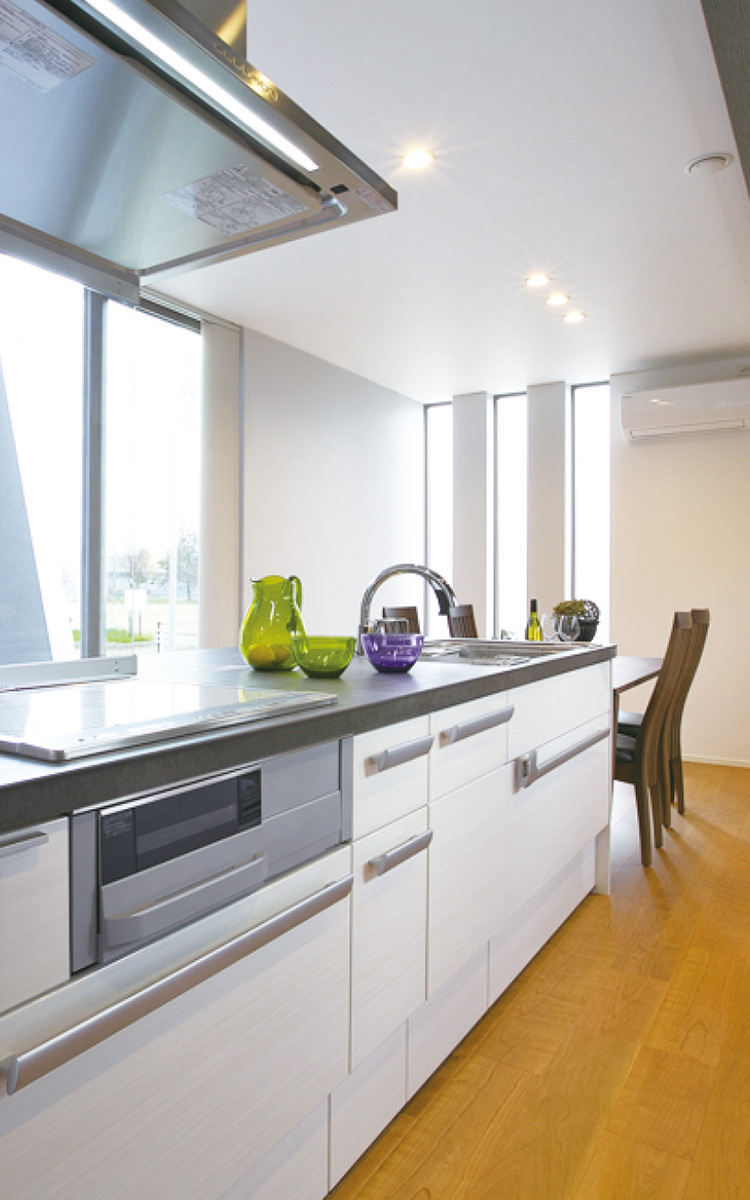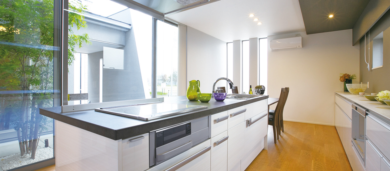 他にも、上品な、しつらいの玄関、セミオーダーで造ったダイニングテーブルを中心としたダイニングキッチン、コートハウスの特徴を活かしたリビングと見所満載です。