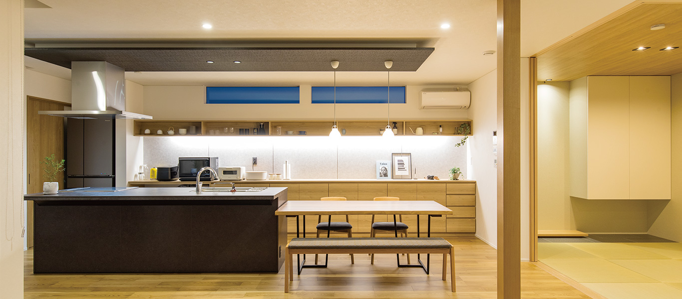 LDK空間に高低差をつくることで、キッチンに立ちながら